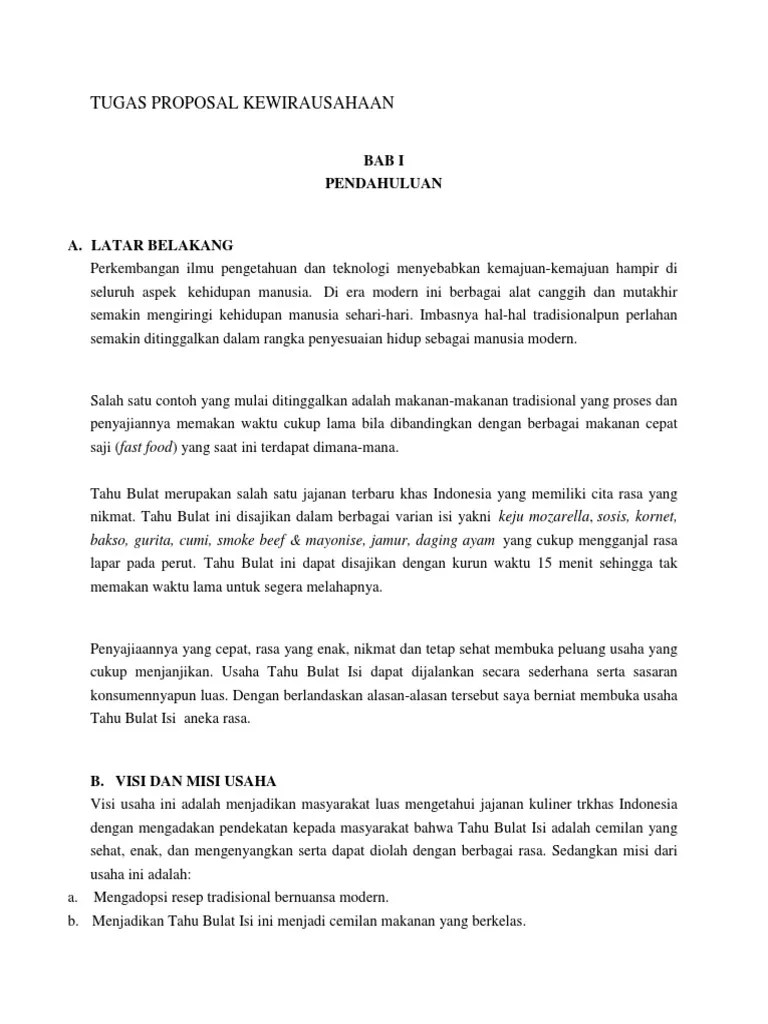 (materi produk kreatif & kewirausahaan kelas xi bdp 1). Investor pasti ingin tahu ini dan lebih memilih untuk memberikan dana kepada . Informasi mengenai peluang bisnis tahu bulat bagi anda yang tertarik menjalankan usaha tahu bulat dalam menambah penghasilan anda. Rafif_8335162828 usaha tahu bulat isi dapat dijalankan secara sederhana serta sasaran konsumennyapun luas. Bagaimana cara membuat proposal usaha yang baik?